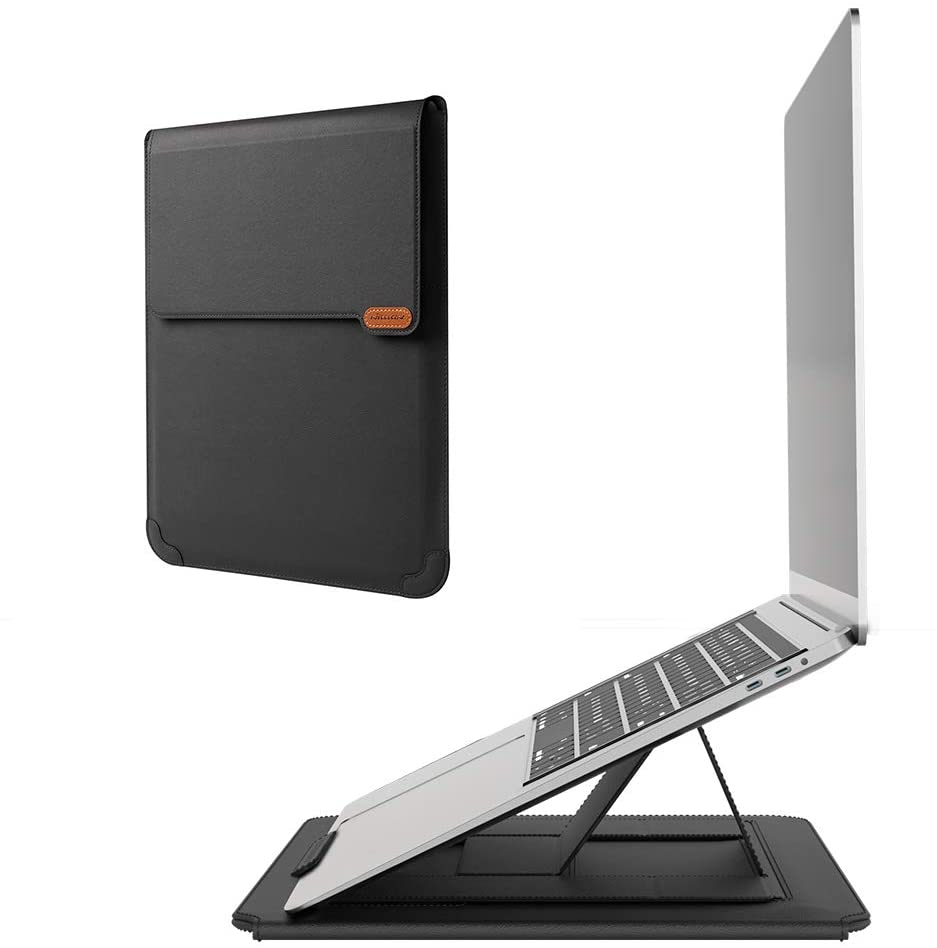It is not only a storage bag, but also laptop stand and mouse mat. Adopt preferred PU, which is scratch-resistant and durable. Use sponge flannel lining inside for shock absorption. Equipped with magnetic stand to speed up the laptop cooling.