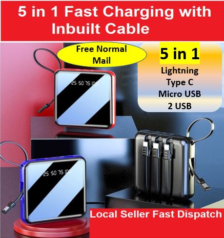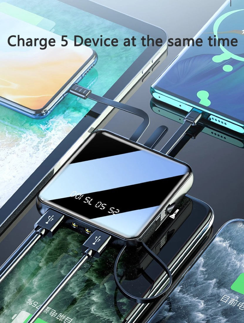 5 OUTPUT: 3 cables: lightning, type c and micro USB and 2 USB