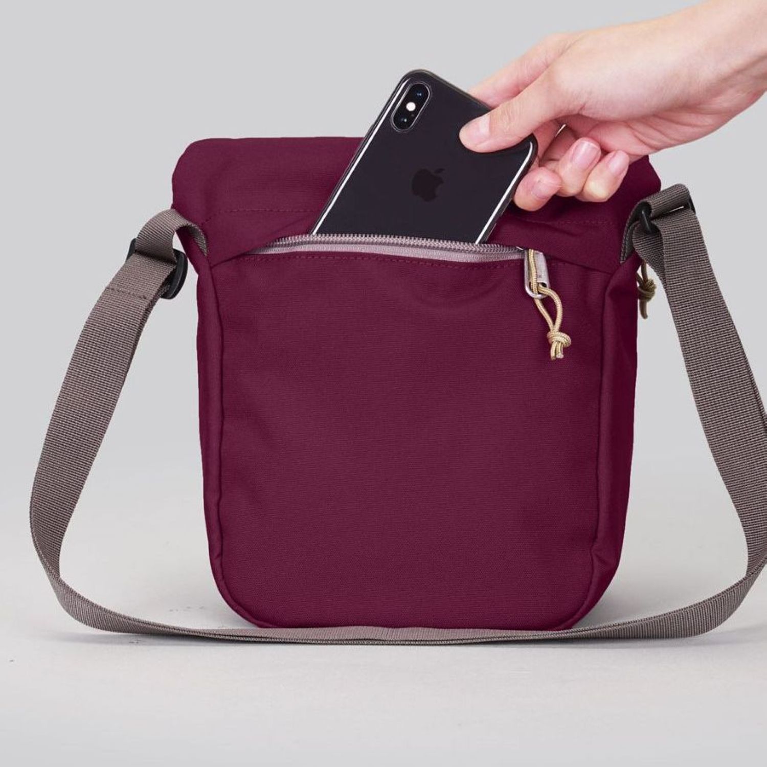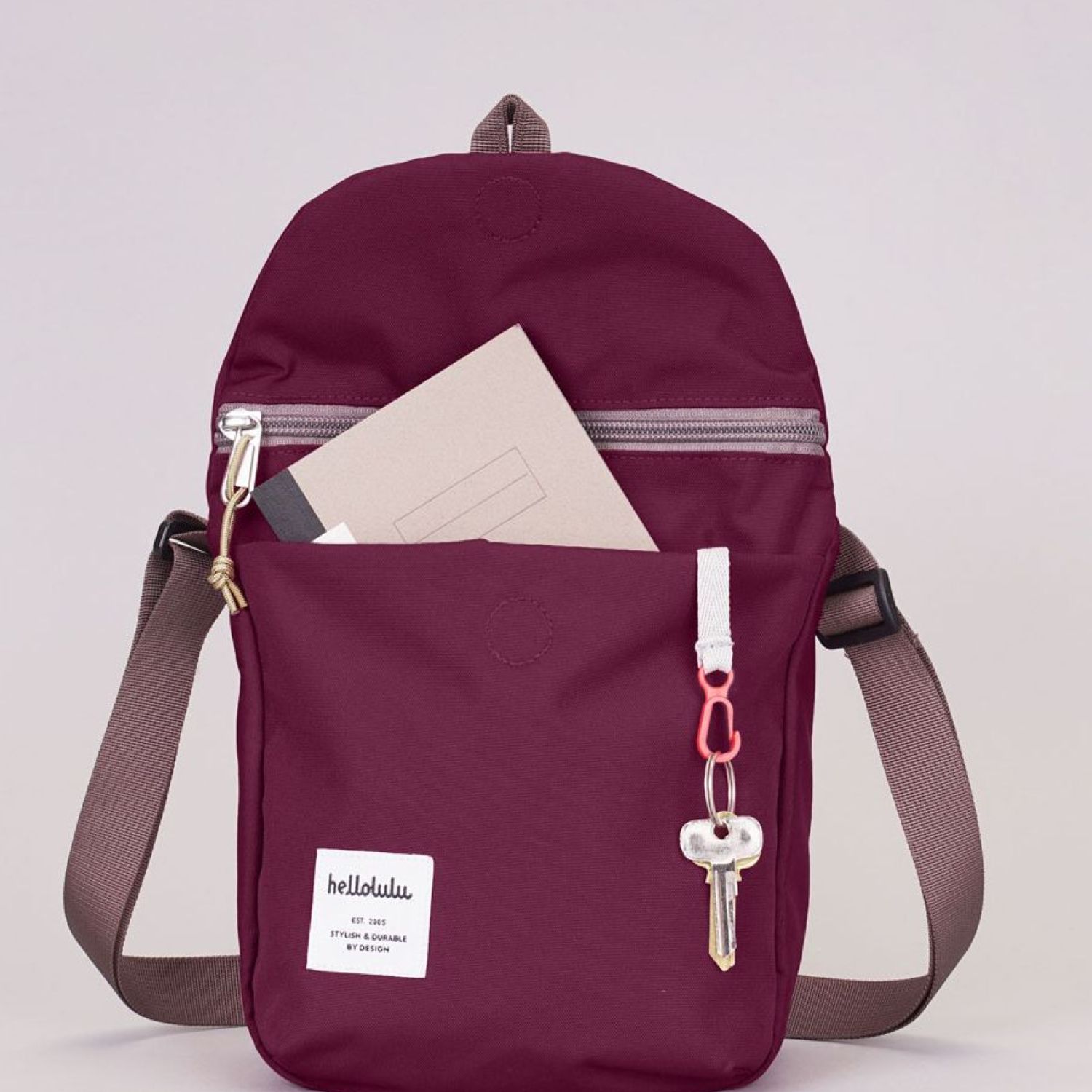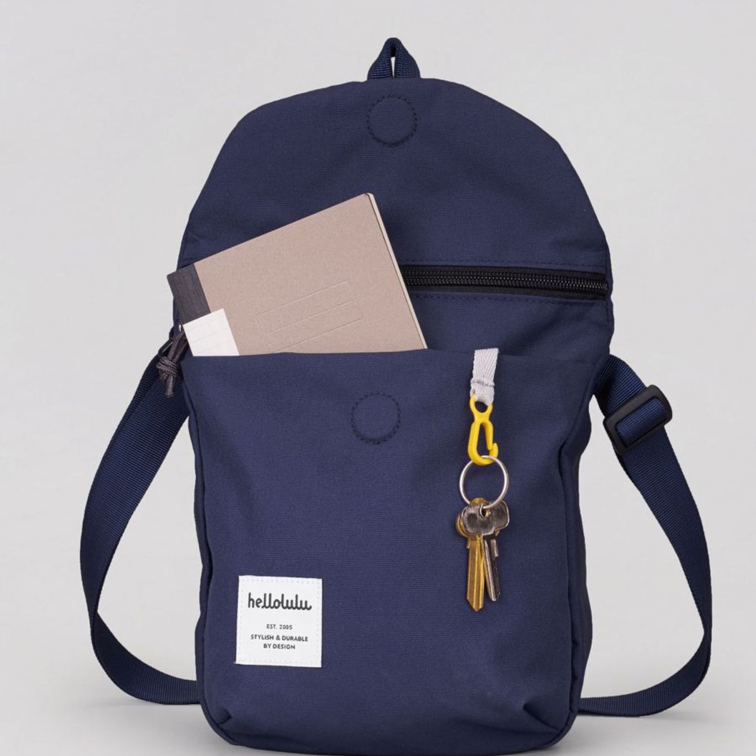 – Quick access front pocket with key clip and back zipped pocket