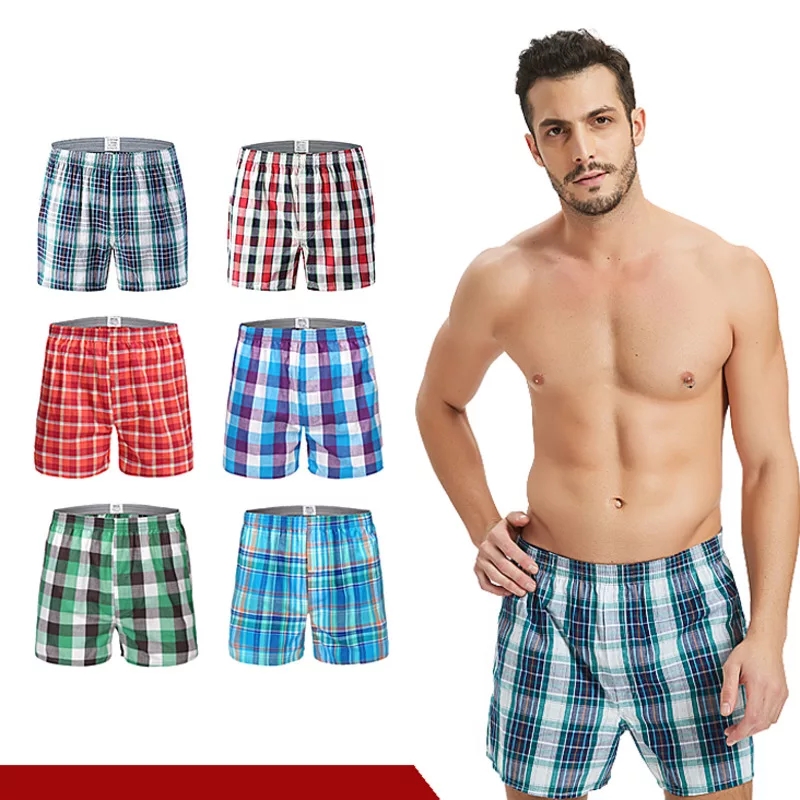 (SG Seller)3Pcs Men Cotton Underwear Plaid Printing Boxer Underwear Plus Size Casual Elastic Waist Beach Pants Boxer Shorts Male Panties Sleep Bottoms Men Home Wear Pajamas Wide Leg Shorts M-6XL
