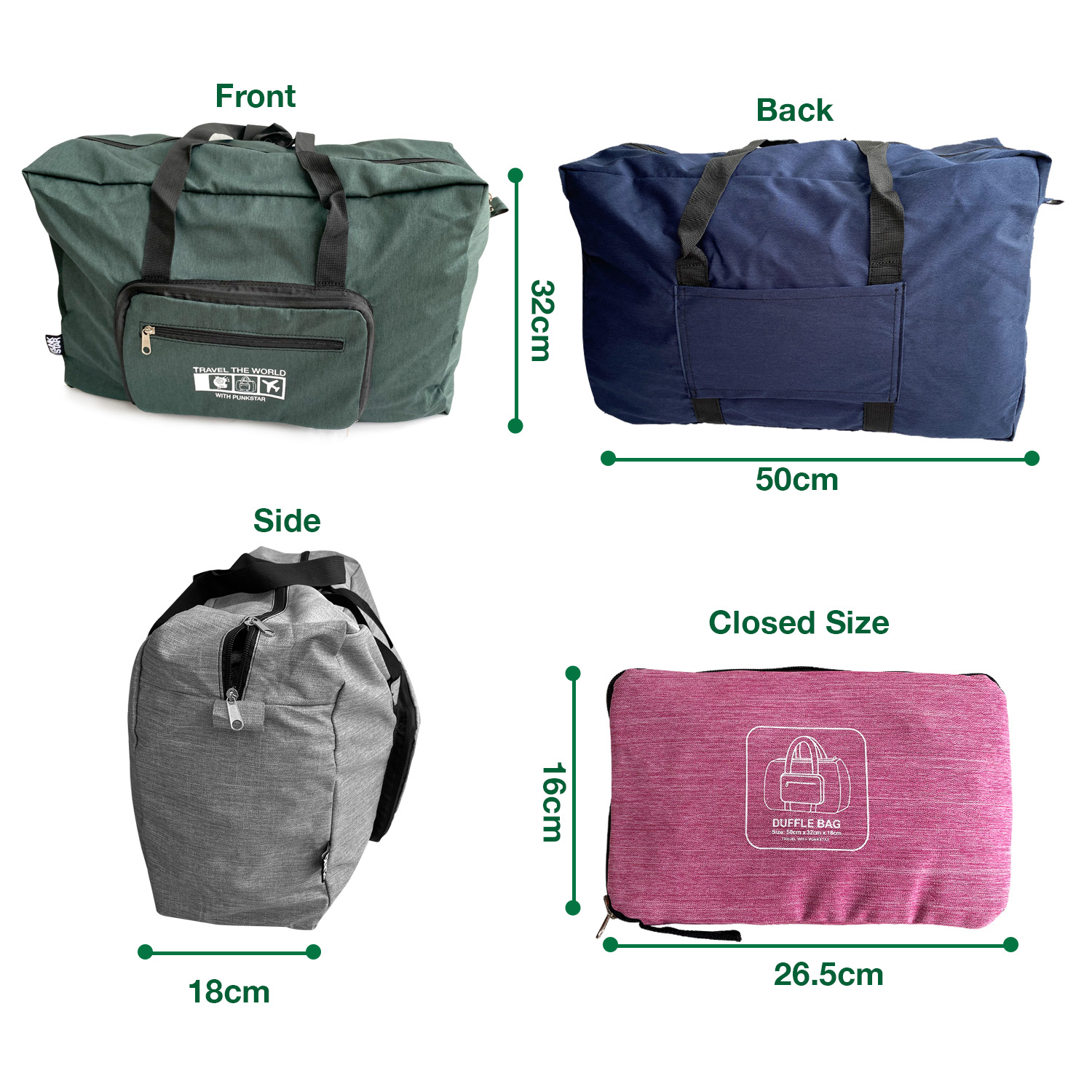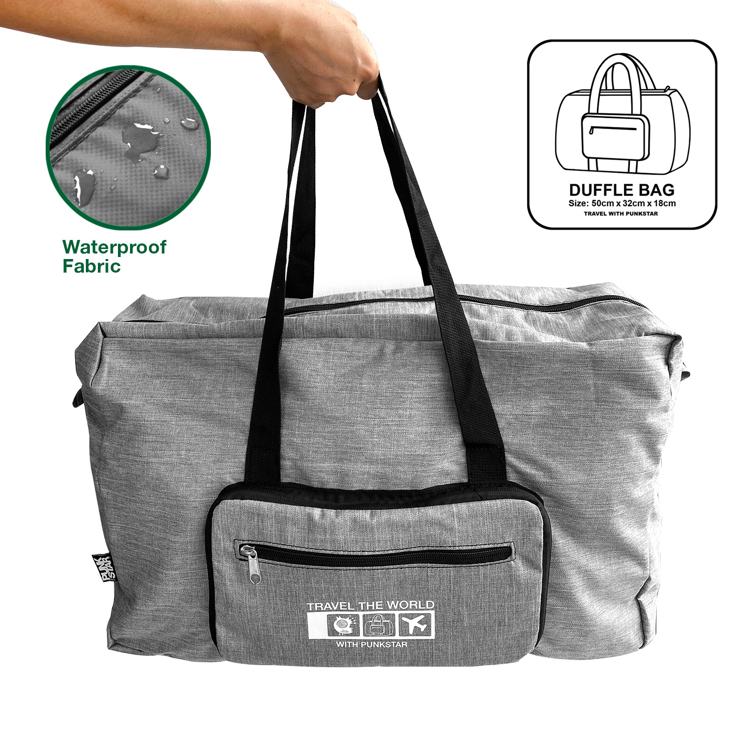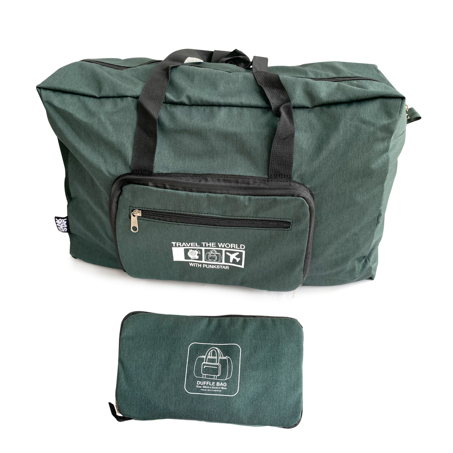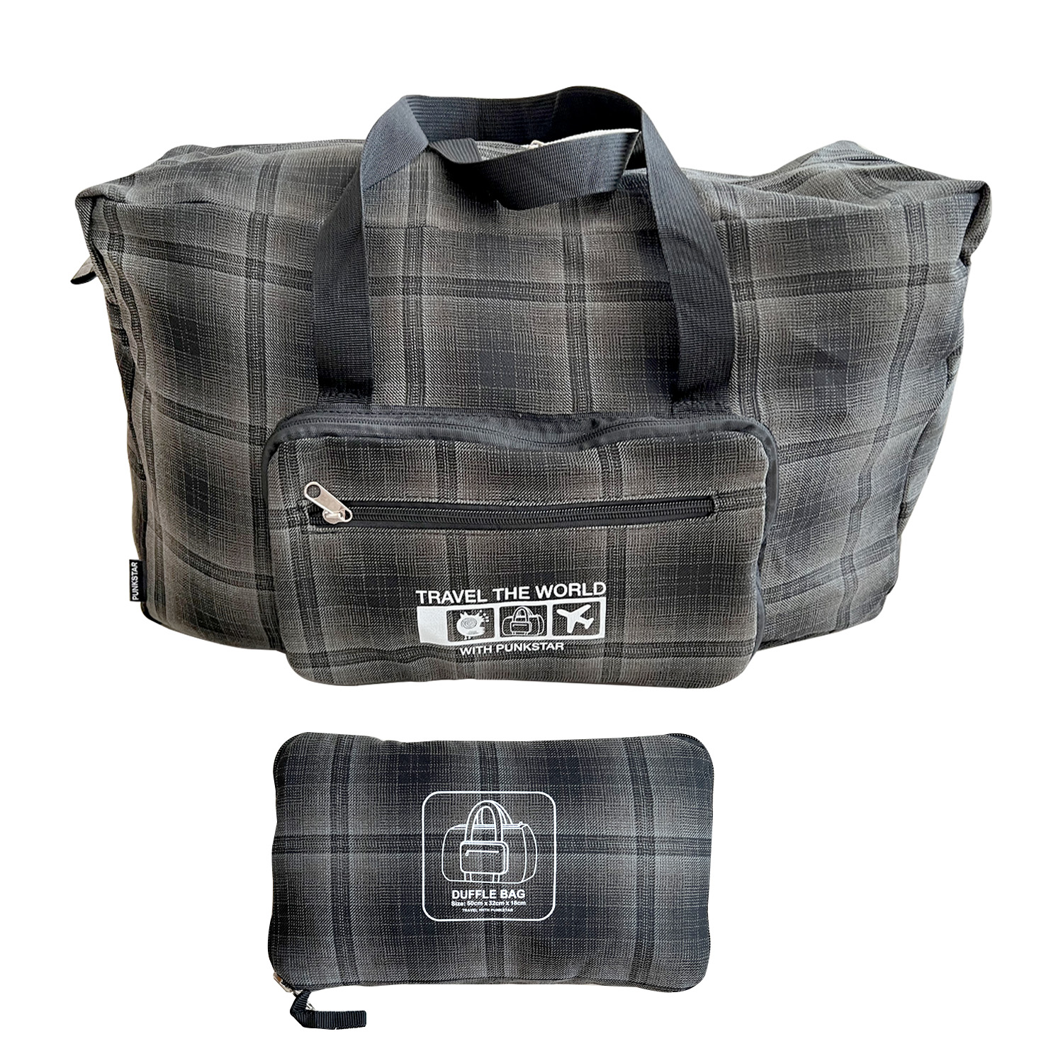 Product Dimensions of unfolded size: 50cm x 32cm x 18cm. PUNKSTAR foldable duffel bag is designed to provide you an organized lightweight travel experience.