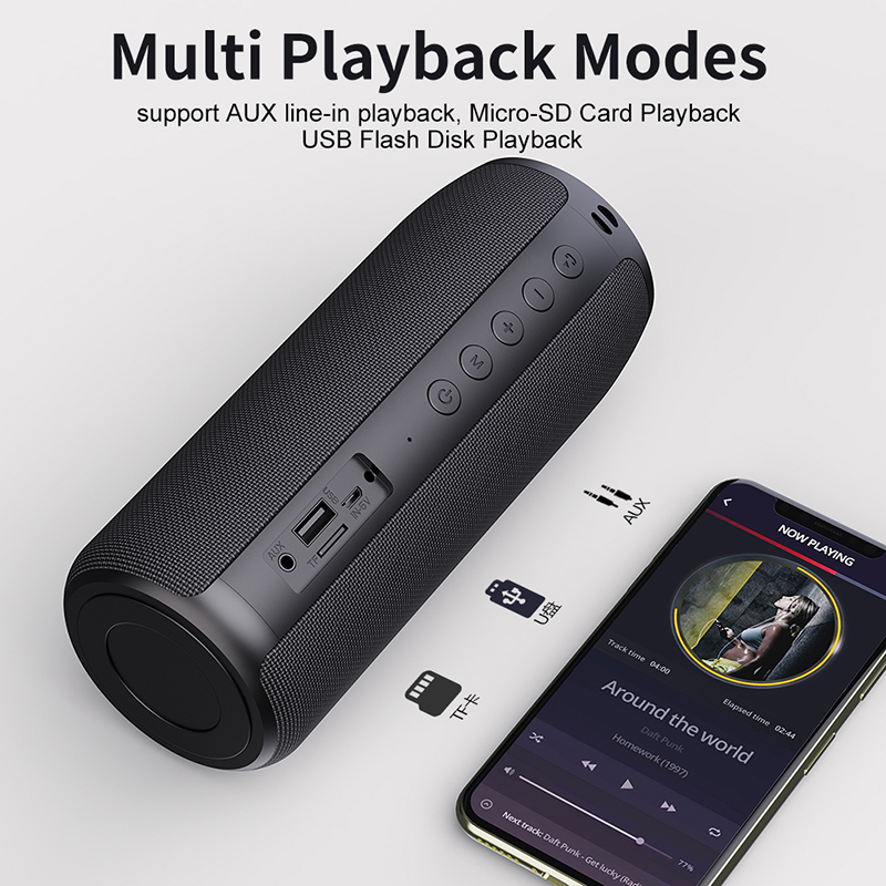 Product Specifications:Bluetooth Version: bluetooth 5.0Transmission Range: 10 to 15 metersRated Power: 5W X 2SNR: >=90dBFrequency: 100Hz-20KHzDistortion: < 1%Working Voltage: 3.7VCharing Voltage: DC 5VBattery Capacity: 2200mAhCharging Time: about 2.5 hoursPlayback Time: about 10 to 12 hoursStandby Time: >= 30 daysCharging Port: Micro USBMicro SD playback: supportAUX Line-in playback: supportUSB Flash Drive Disk Playback: supportSpeaker Dimensions: 75 x 75 x 185mmProduct Weight: about 500gWhat's in the box:1 x bluetooth speaker1 x charging cable1 x lanyard1 x user manual