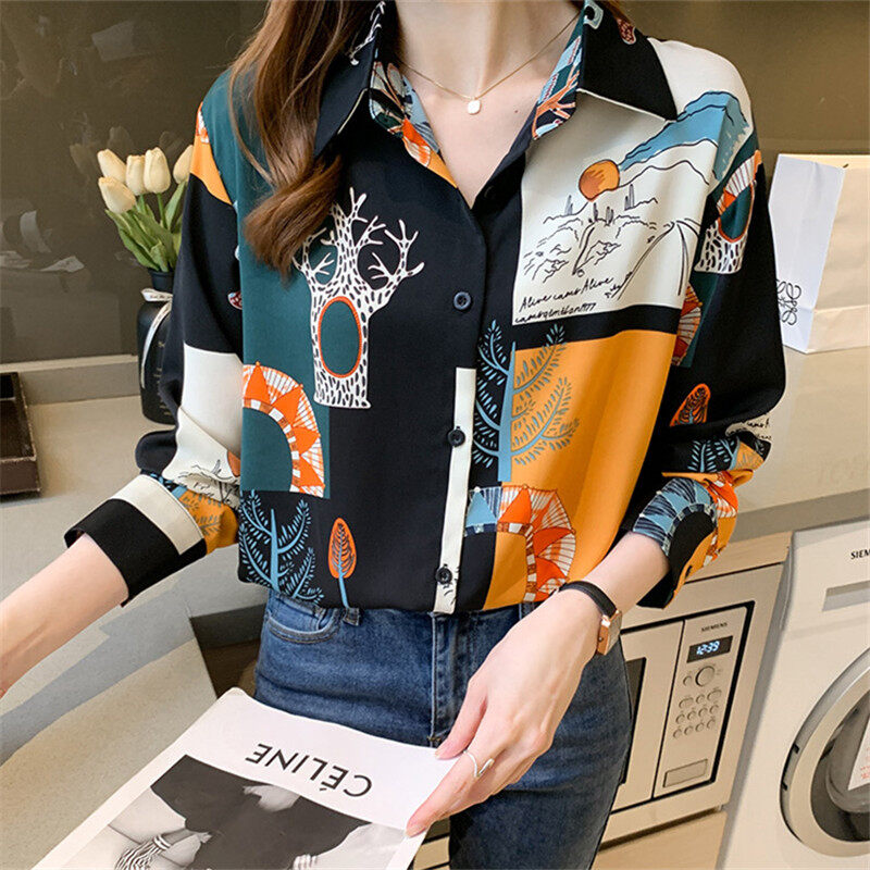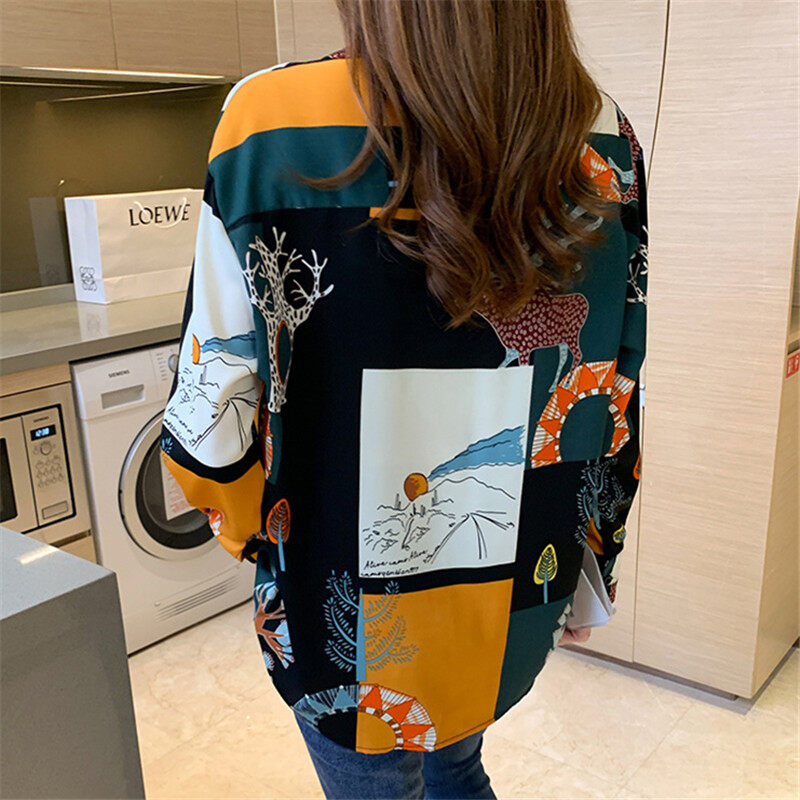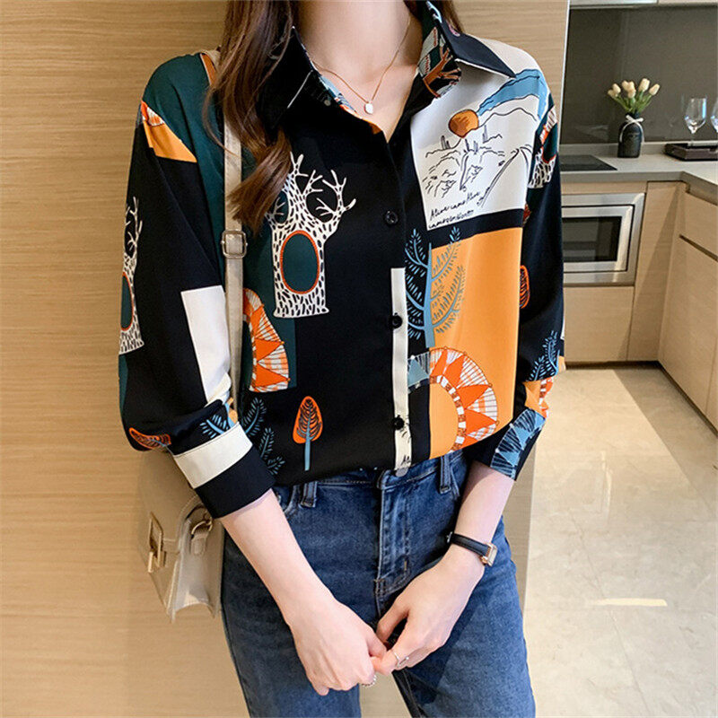 Vintage Shirt Women Korean Style Casual Printed Blouse Long Sleeve Chiffon Ladies Tops Loose Shirts