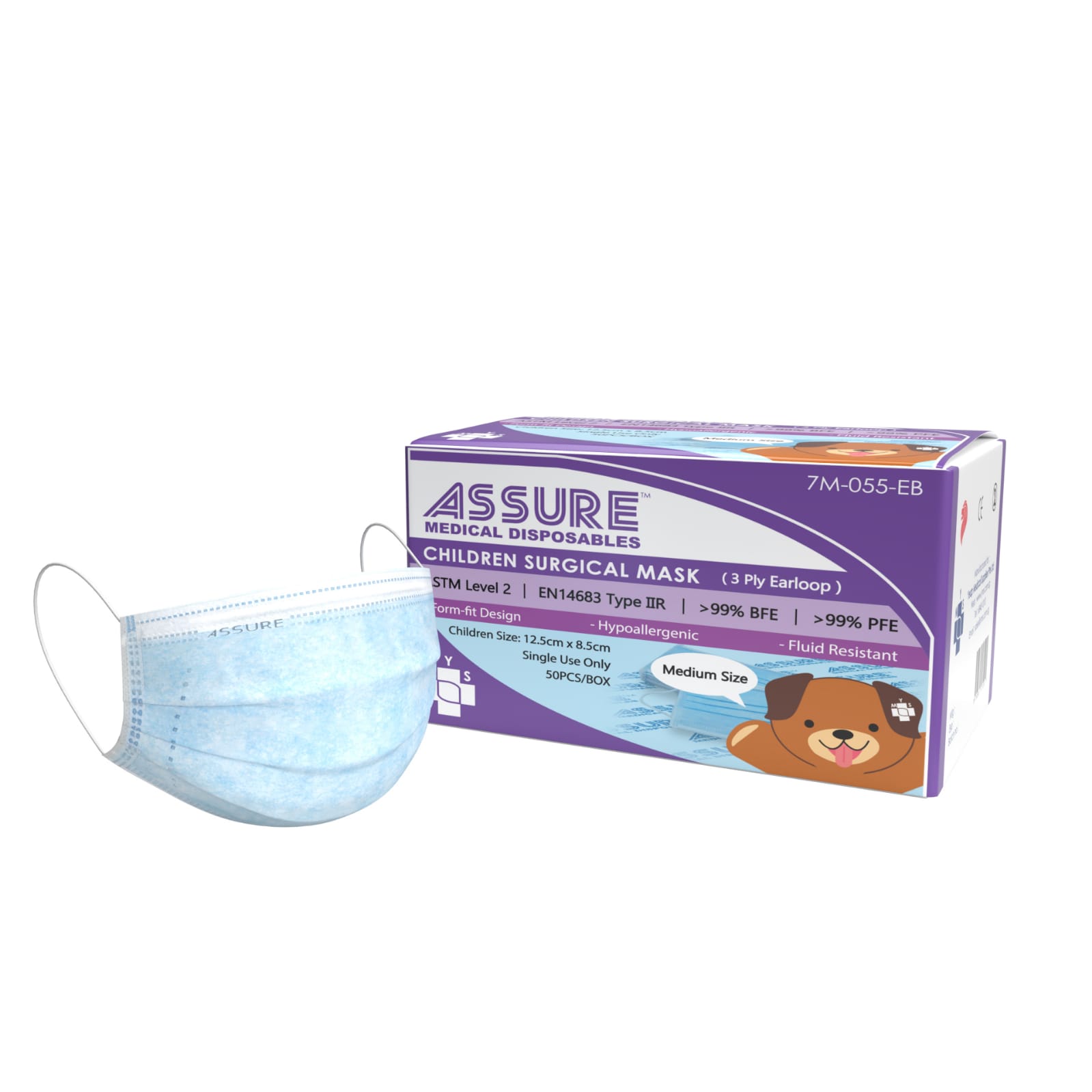 ASSURE Surgical Face Mask for Child, Children, Kids and TODDLER 3-Ply Earloop, Medium Size (12.5cm x 9.5cm), 50 Pcs/Box bundle