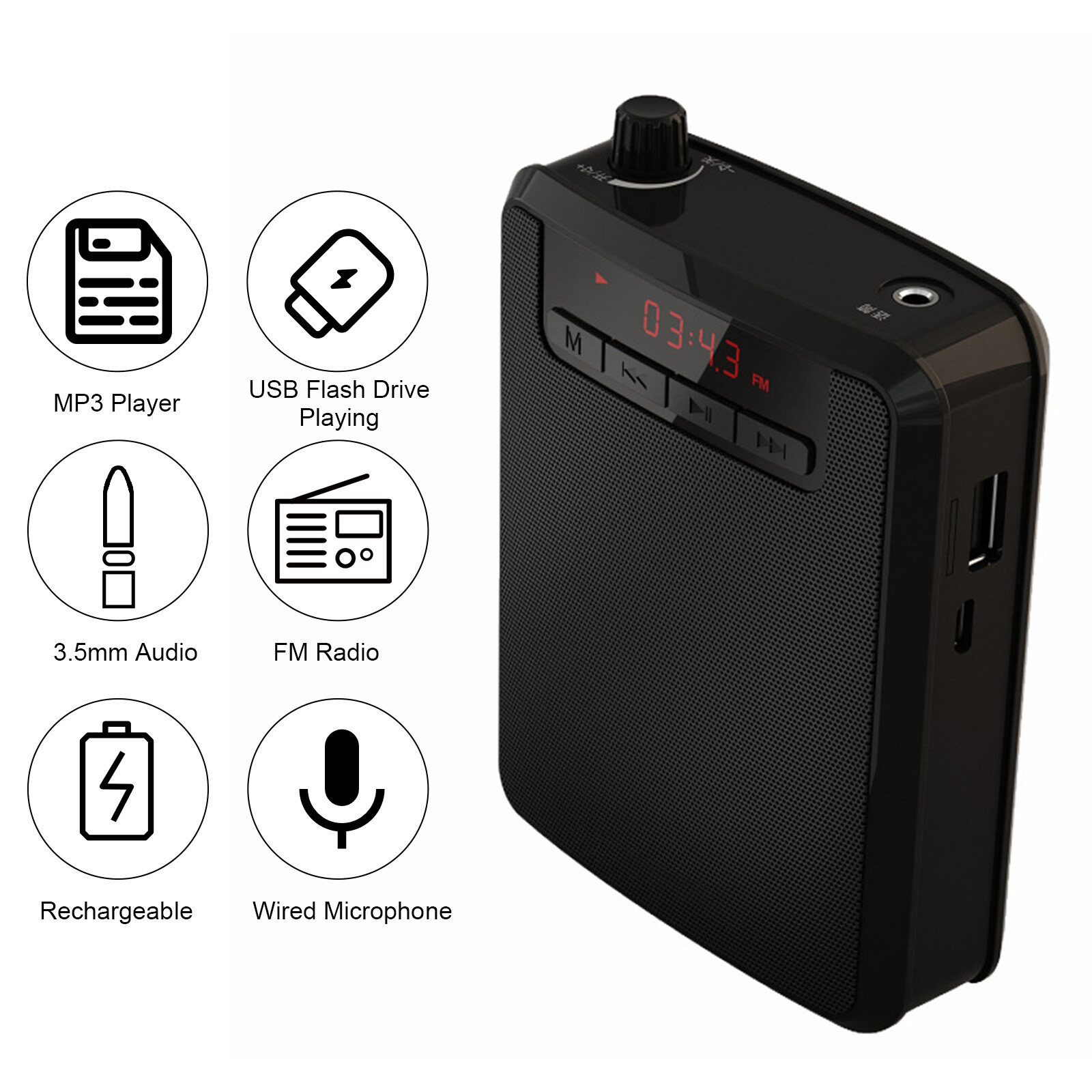 This is a rechargeable mini voice amplifier for teachers, training, coaches, tour guides and presentations, etc. Equipped with wired microphone headset and belt, it is portable and easy to use.
