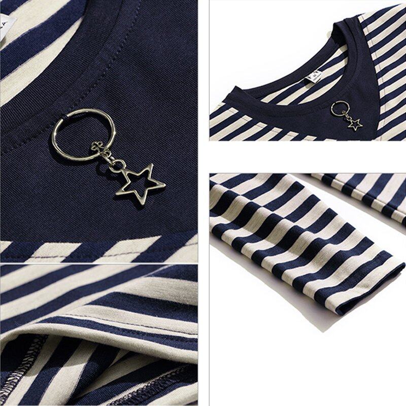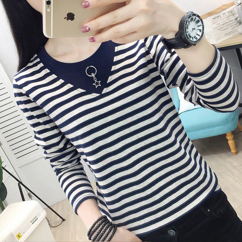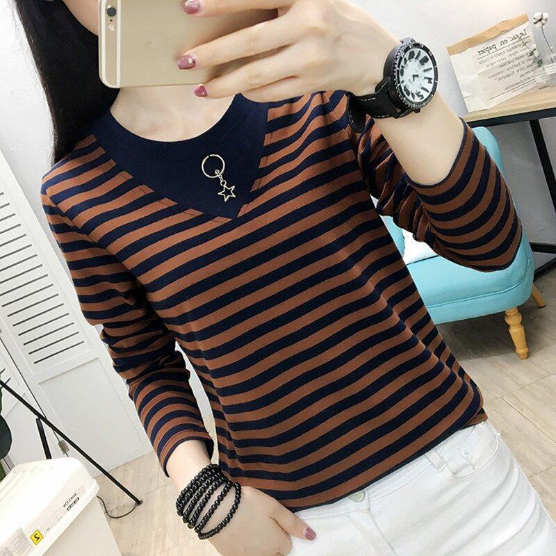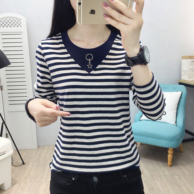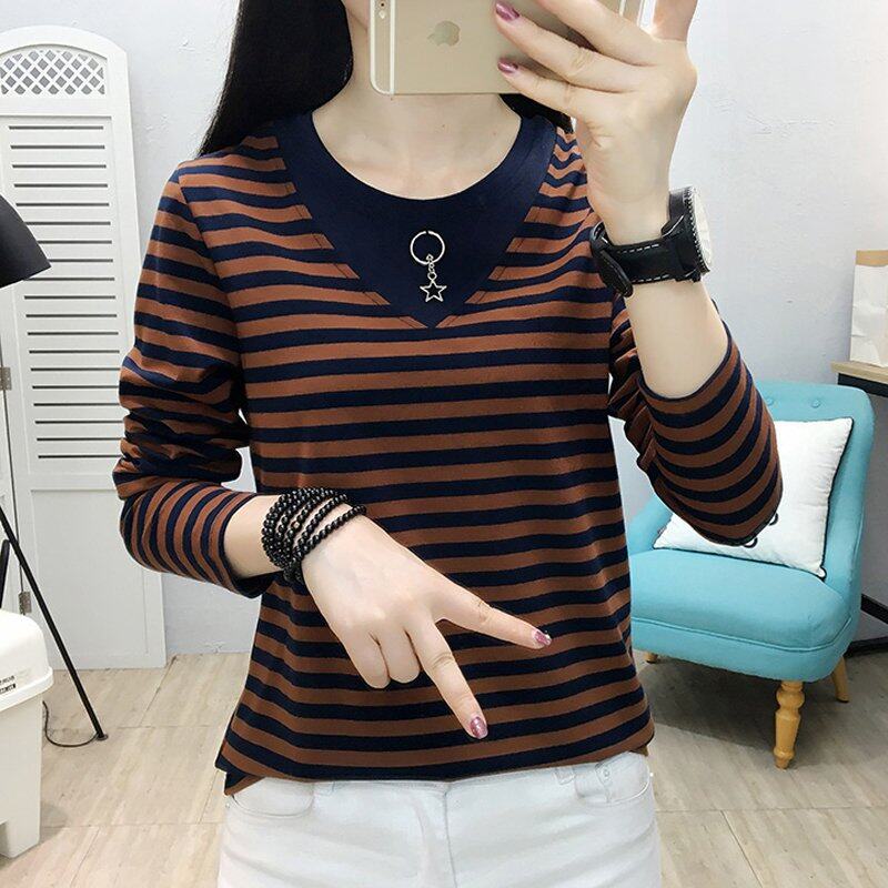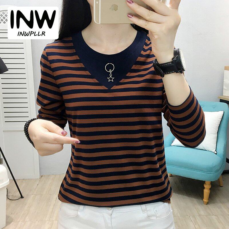 • INWPLLR Autumn Women T-shirts Striped Patchwork T-Shirts Korean Long Sleeve Large Size Tops Female Casual O-Neck Tshirts For Women