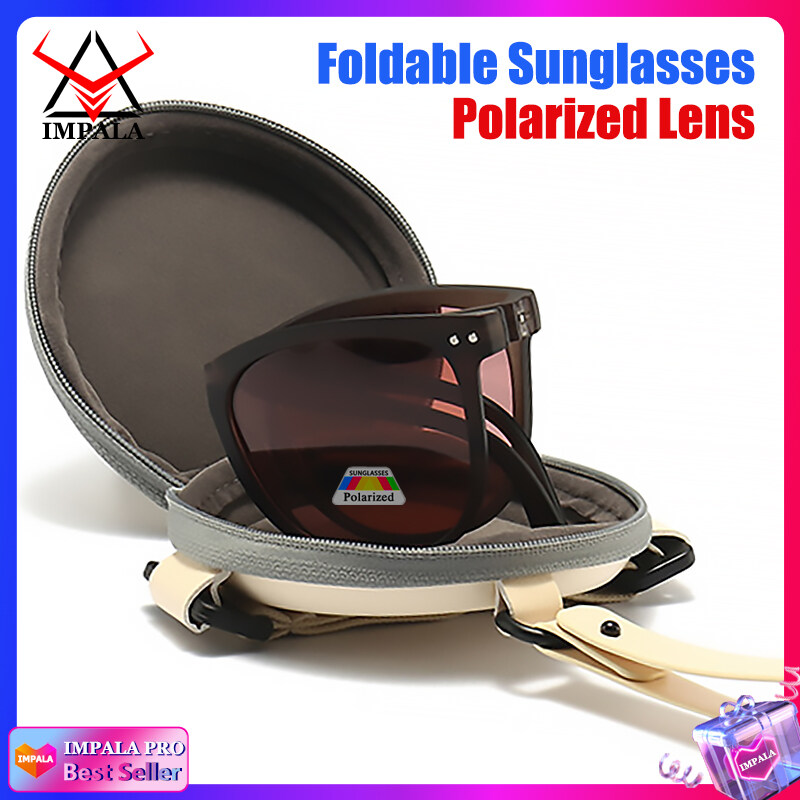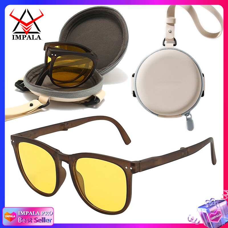 IMPALA PG1645Y Fashion Korean Style Polarized Foldable Sunglasses for Women HD Lens Sun Glasses with Cute Round Glasses Case Anti Glare UV400 Protective Sun Glasses