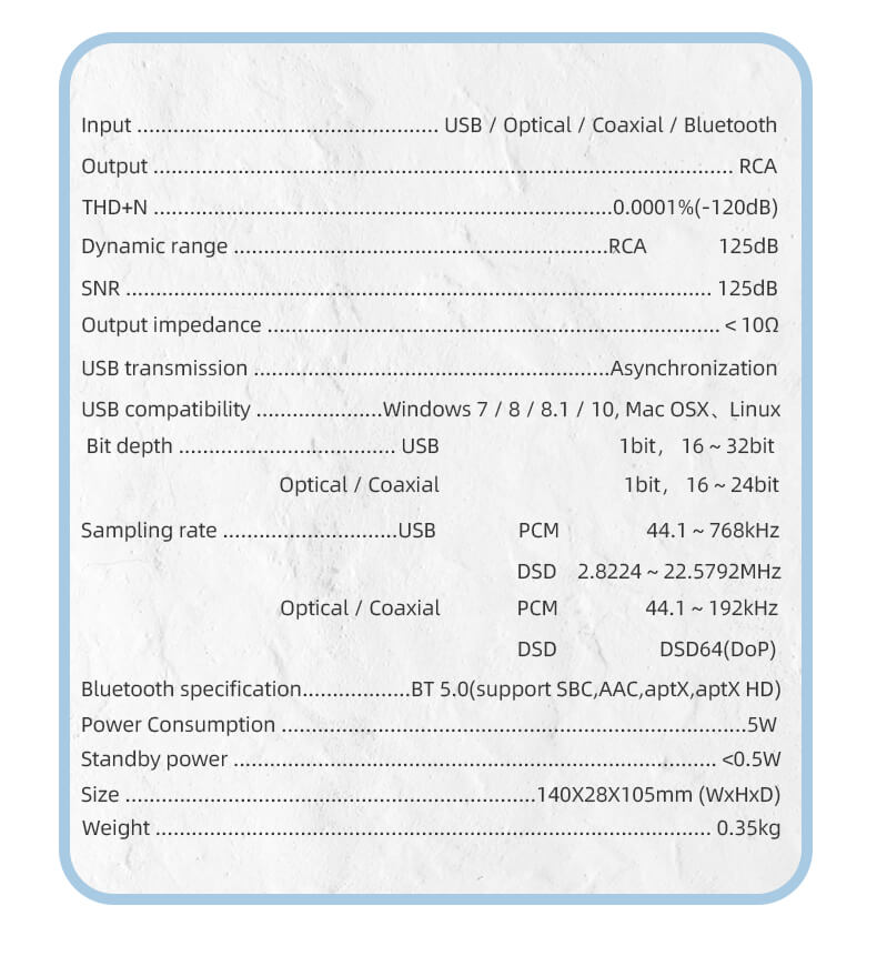 >The premium Sabre DAC chip is supported by 2nd gen USB signal processor by XMOS. It enables high-resolution 32-Bit/768kHz PCM and native DSD512 decoding over USB connections. Bring support for true high-res signals to your PC with the S.M.S.L SU-6.