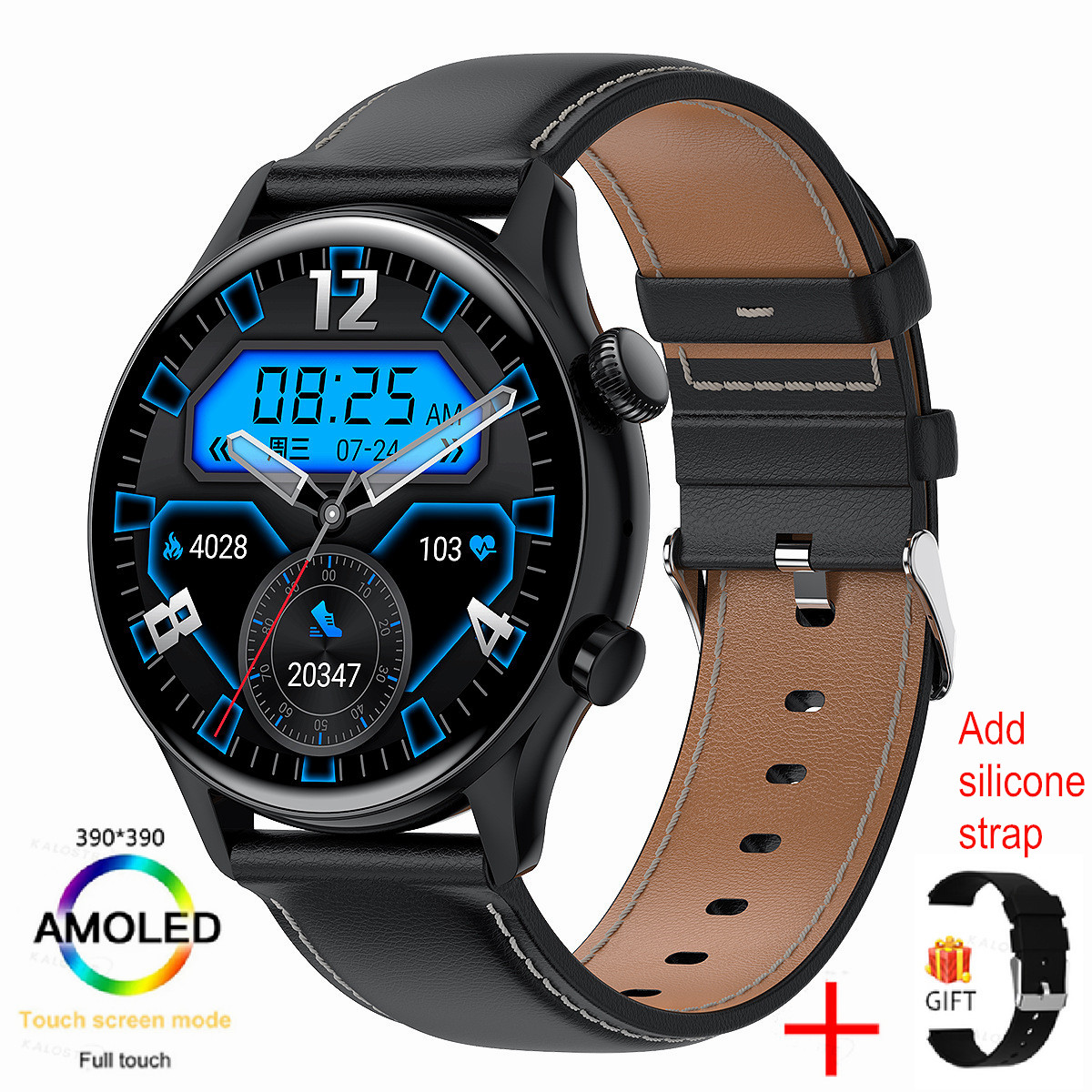 Main functions: Bluetooth call, voice control, always-on screen, Alipay offline payment, NFC, password unlock, female physiological cycle, custom dial, weather forecast, music control, pedometer, heart rate, sleep, sedentary, mileage, blood Oxygen, blood pressure, search, calories, push notifications.
