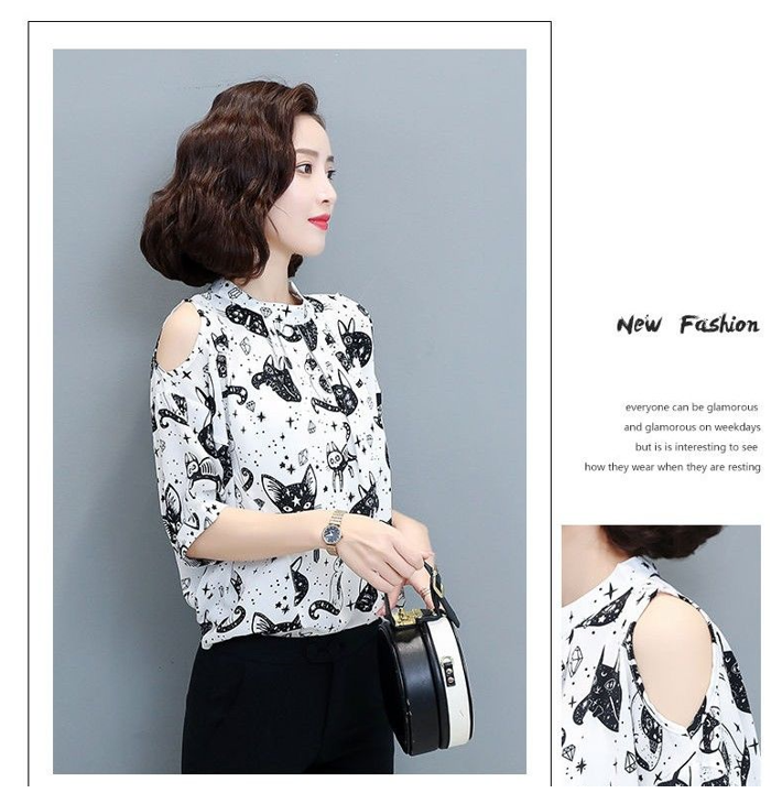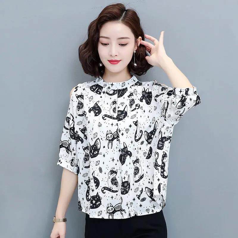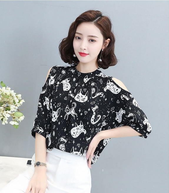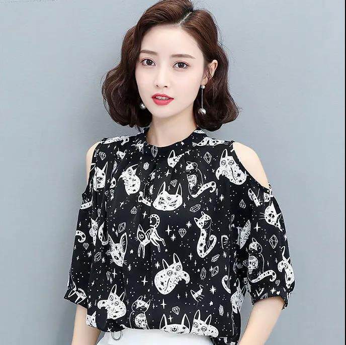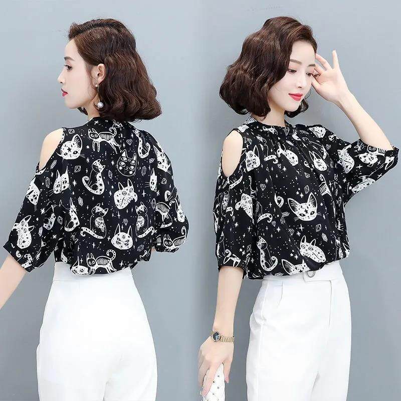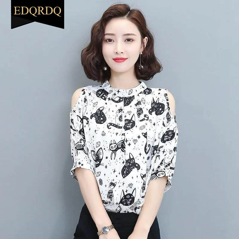 EDQRDQ Women's Off The Shoulder Chiffon Blouses Summer 3/4 Sleeves Animal Printed Tops Shirts