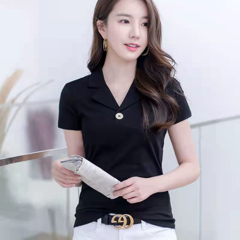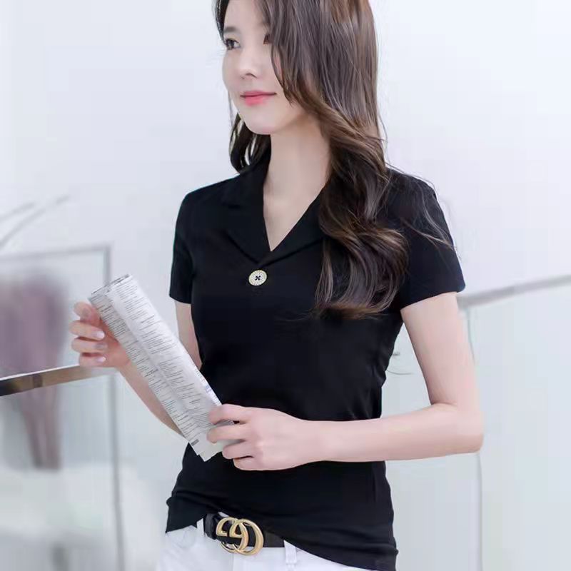 100KG Can Wear Suit Collar Short Sleeve T-shirt Women Polo Shirt Korean Style Temperament Elegant V Neck Retro Plain Shirt Female Lapel t shirt Plus Size Work clothes high-quality