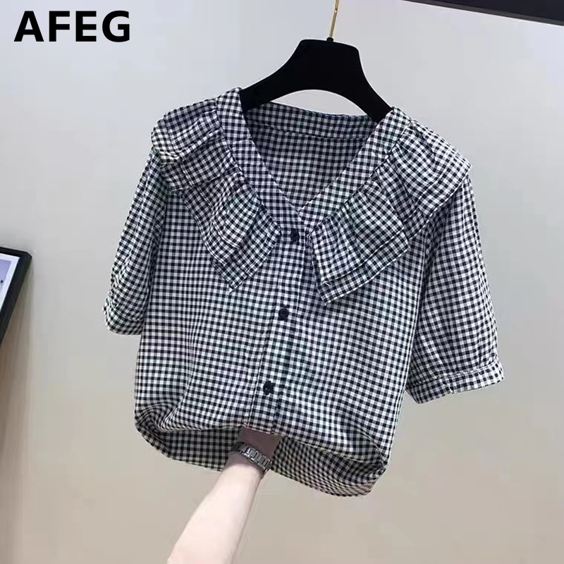 AFEG new Korean version V-neck ruffled fashion loose all-match plaid chiffon short-sleeved blouse for women