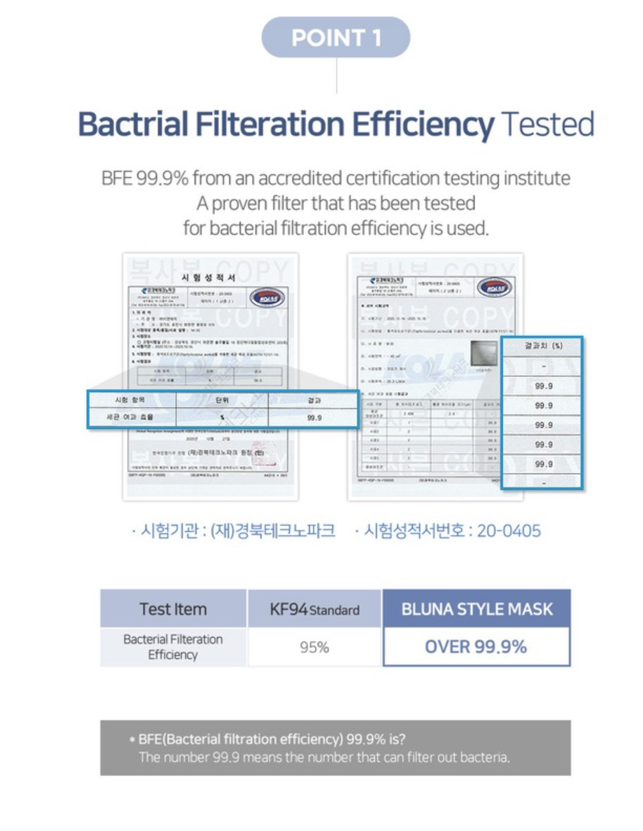 Mask filtration performance is BFE 99.9 %. Protects from bacteria with its excellent defence performance.