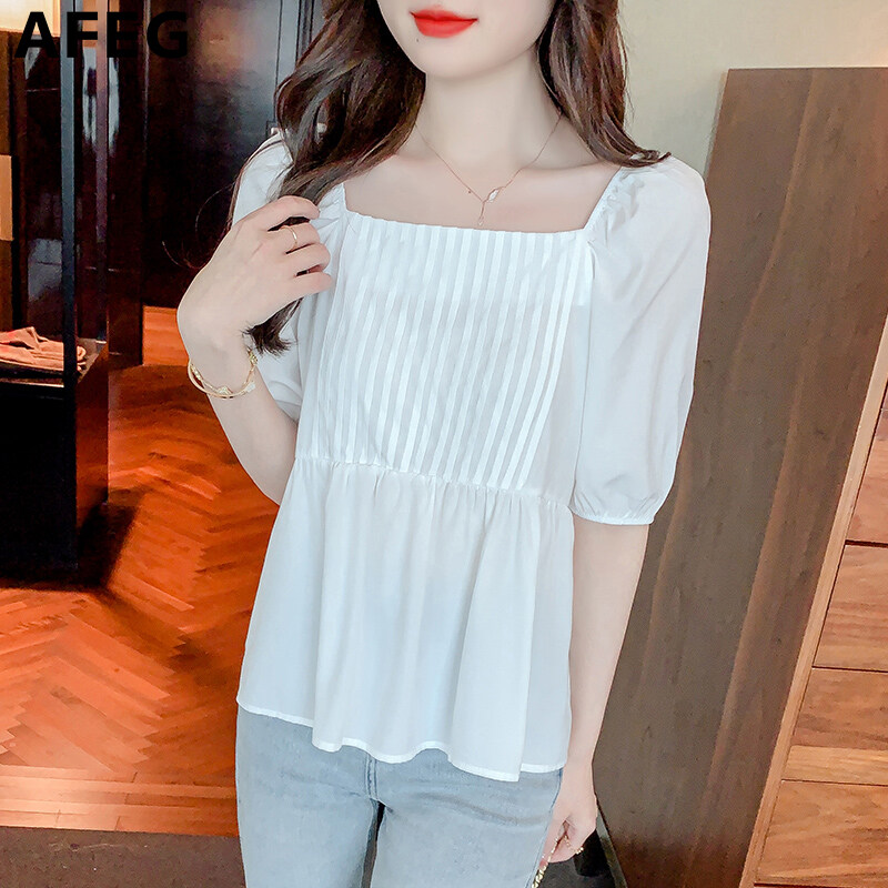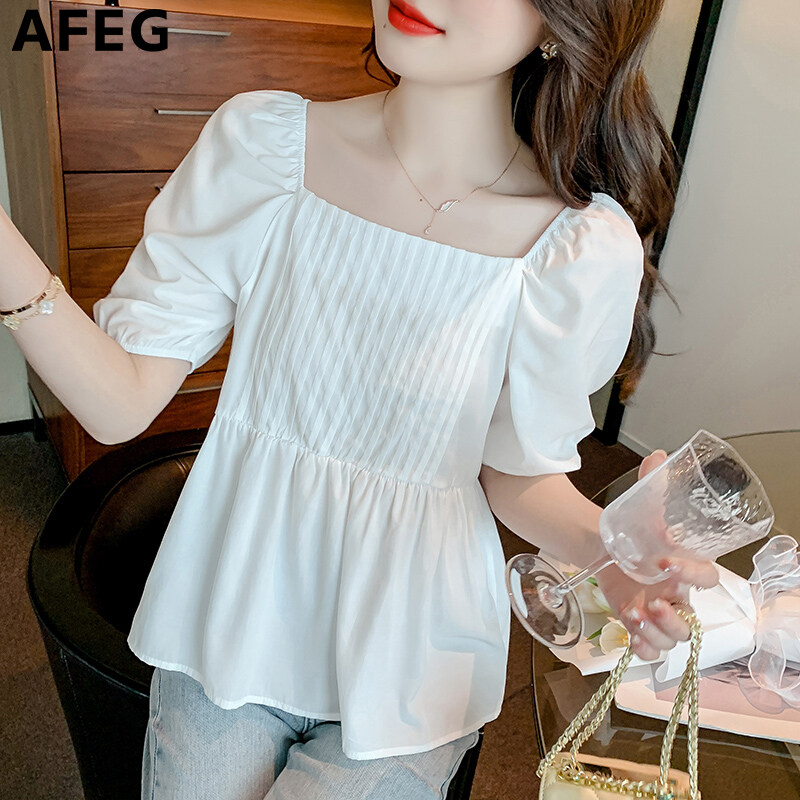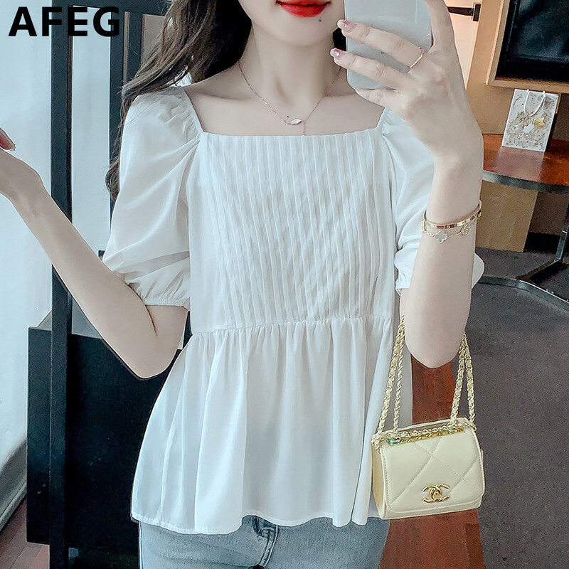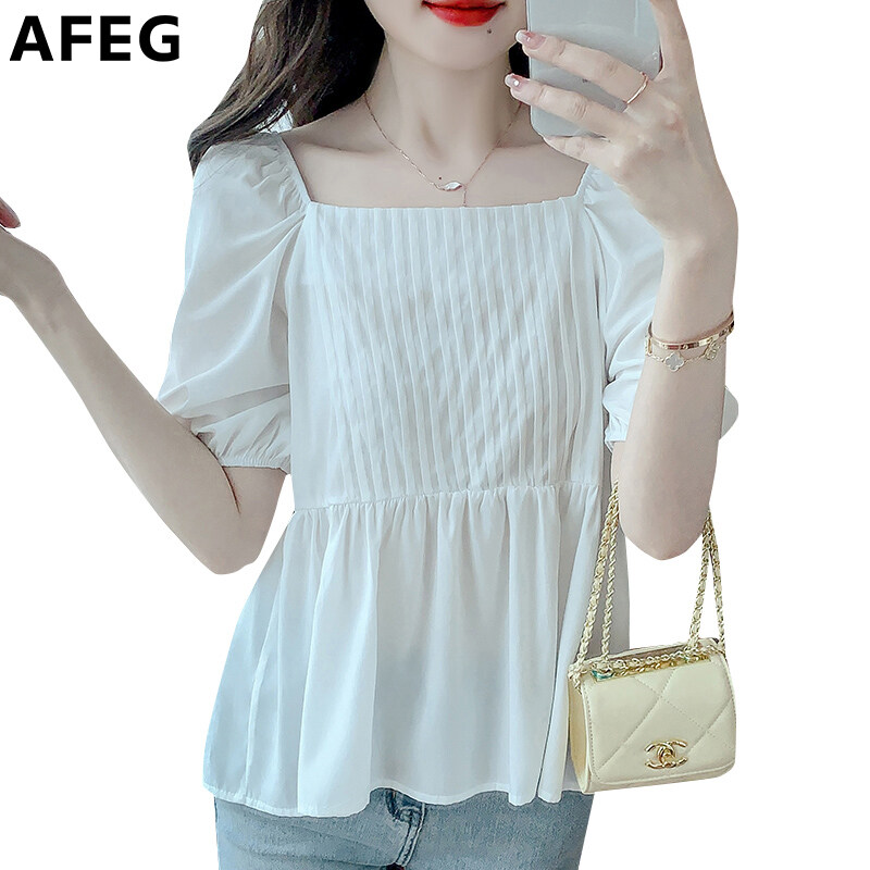 AFEG new Korean style square neck fashion loose all-match chiffon puff sleeve blouse for women