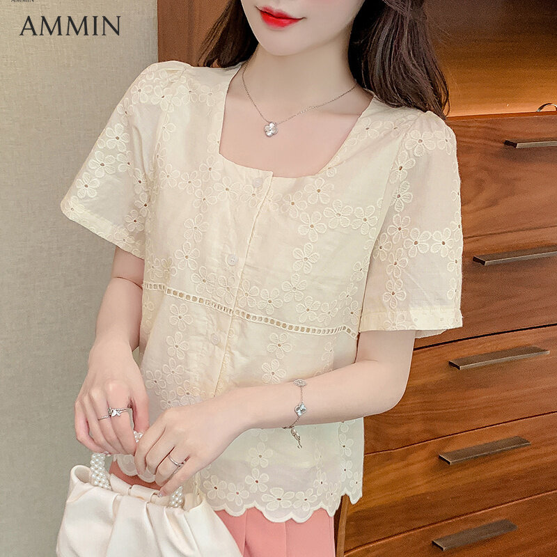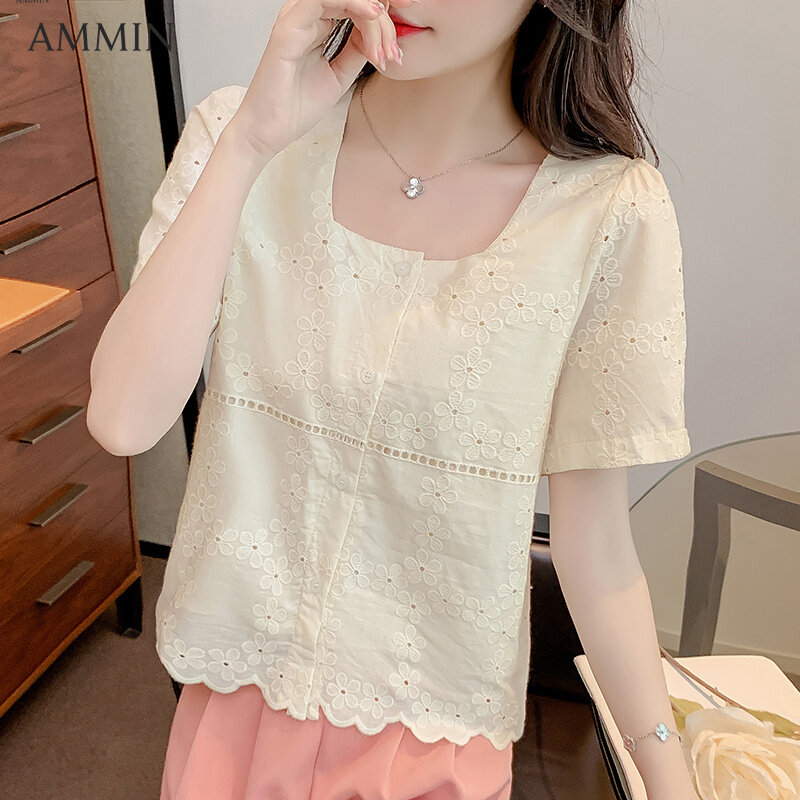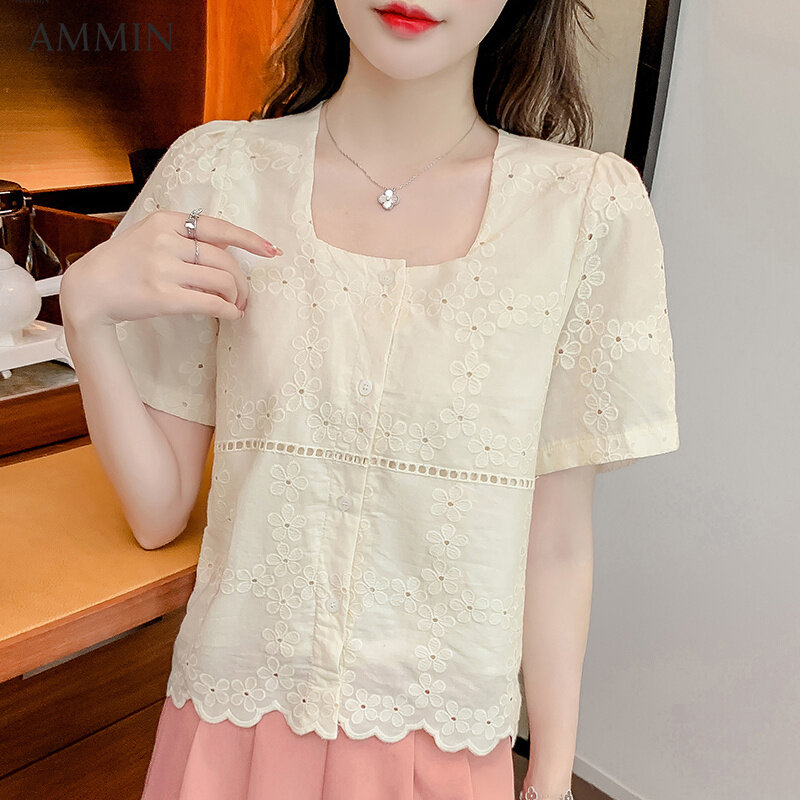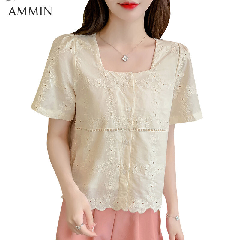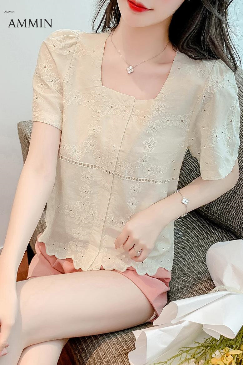 AMMIN Korean style women's short-sleeved square-neck lace shirt Korean style fashion temperament summer short lace stitching chiffon Top casual wild Blouse