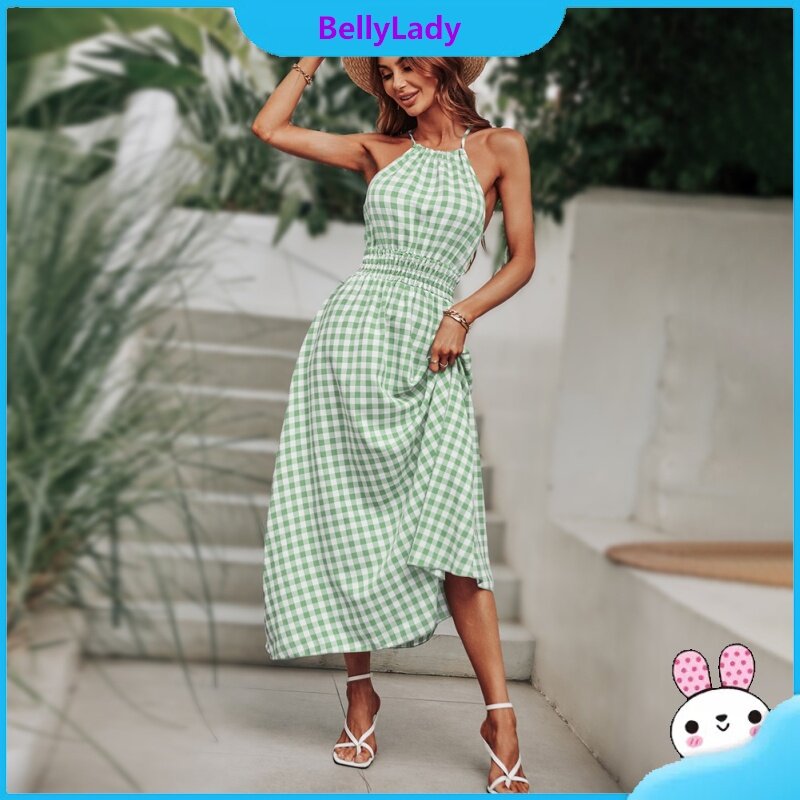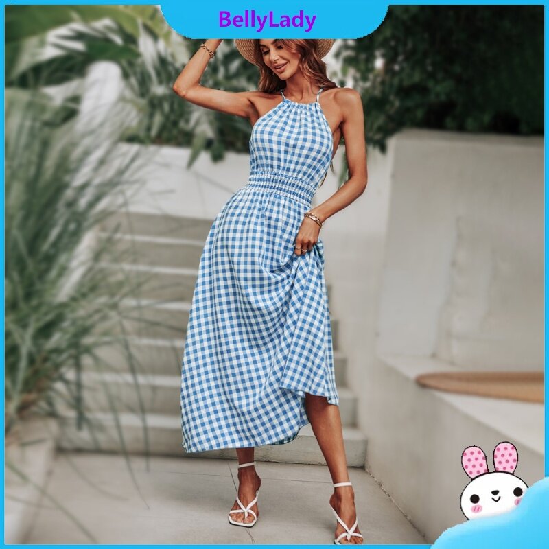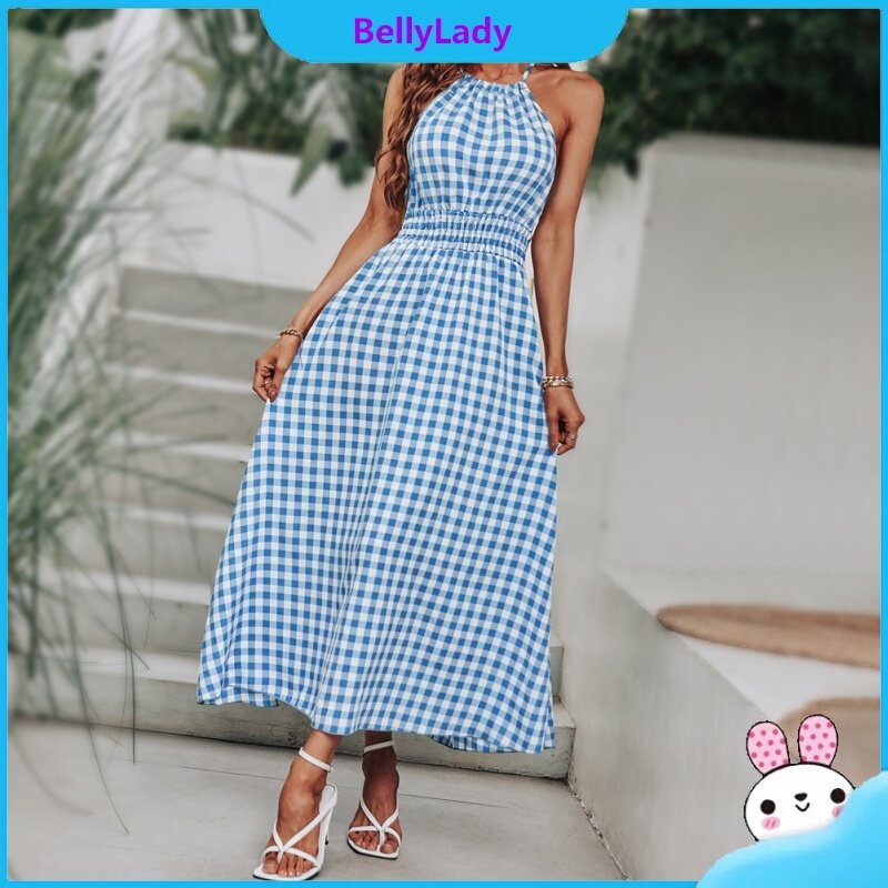 Women Summer Dress Sleeveless Waist-in Suspender Long Skirt Stylish Plaid Printing Dress