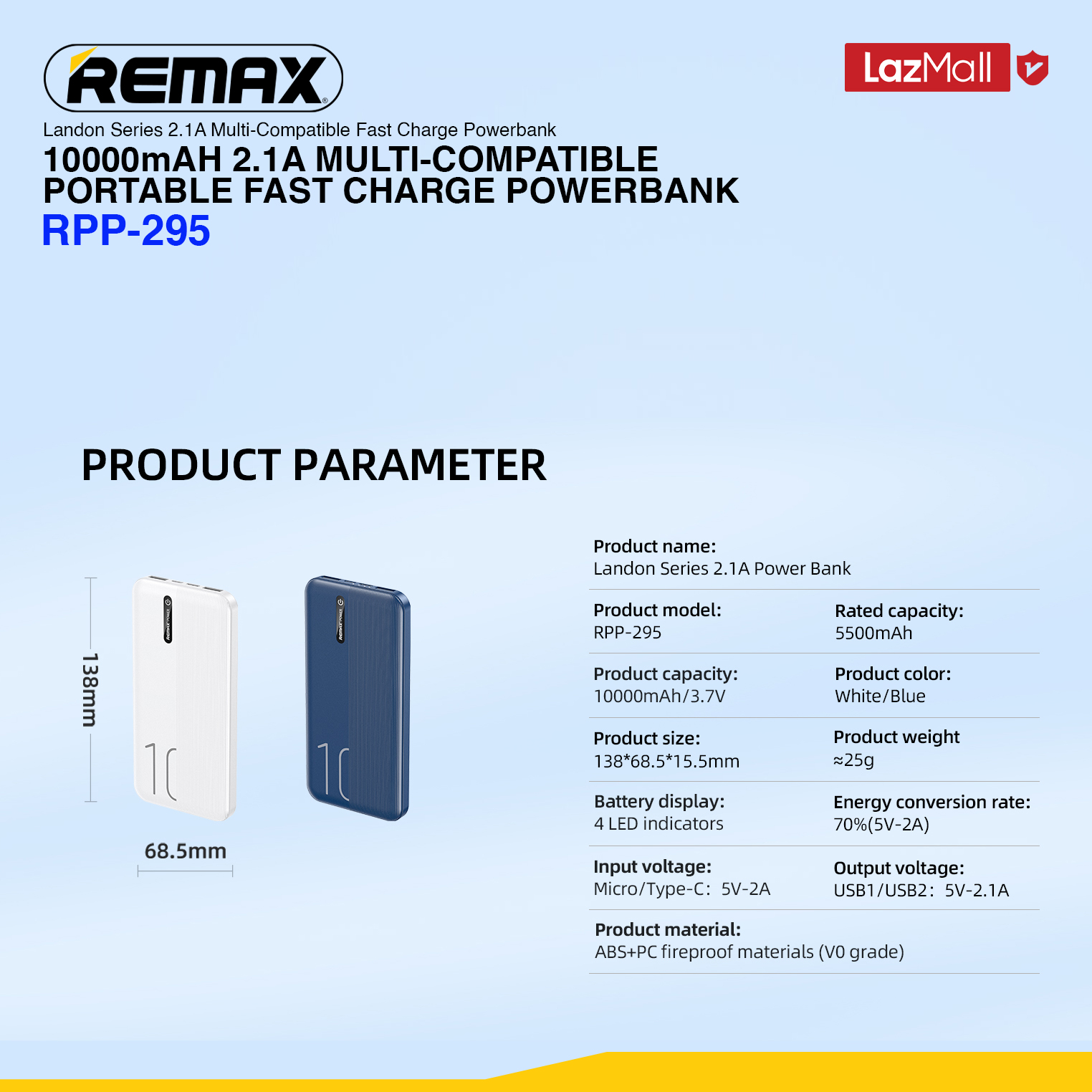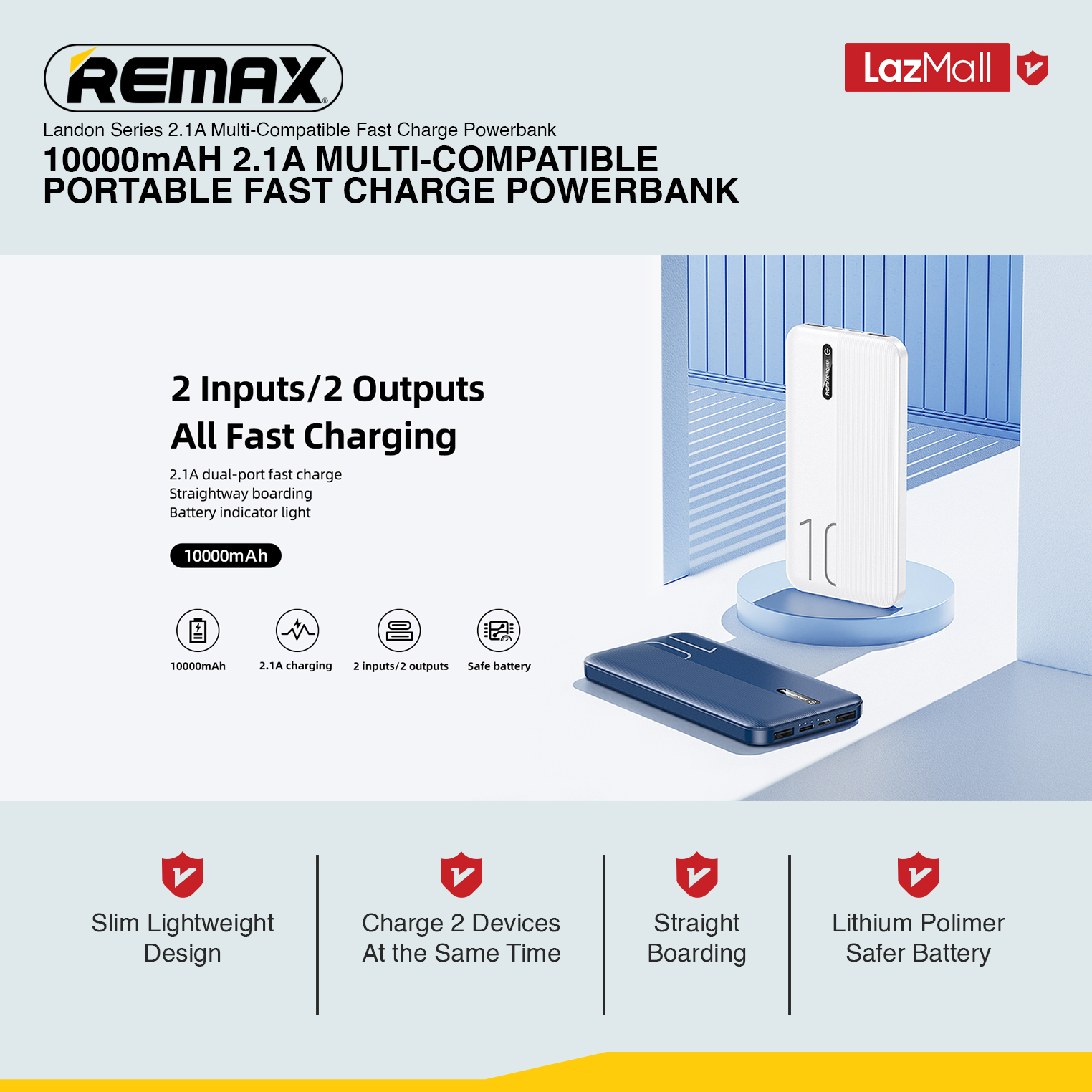 [Remax Energy] RPP-295 10000mAH Landon Series 2.1A Slim Lightweight Multi-Compatible Straights Boarding Fast Charge Power bank