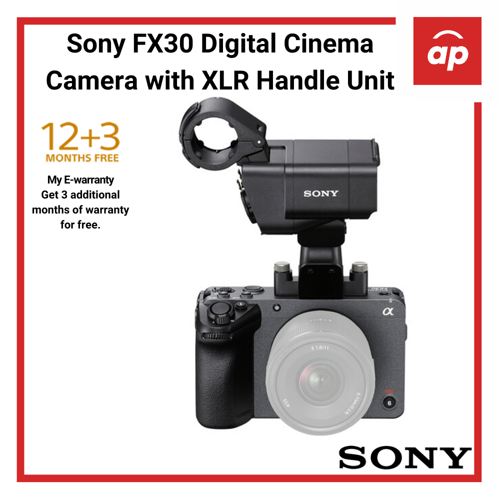 This version comes with a detachable XLR Handle Unit that offers two XLR/TRS combo inputs for using professional audio equipment. The handle features a microphone mount, physical audio controls, and three 1/4"-20 threads for attaching accessories. It also securely mounts to the FX30 via the Multi Interface Shoe and a pair of screws.