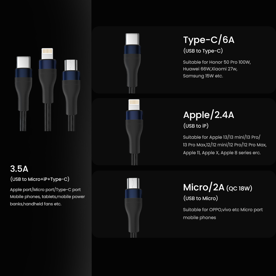 - Triple Simultaneous Charging Cable (Micro USB, iP and Type-C)