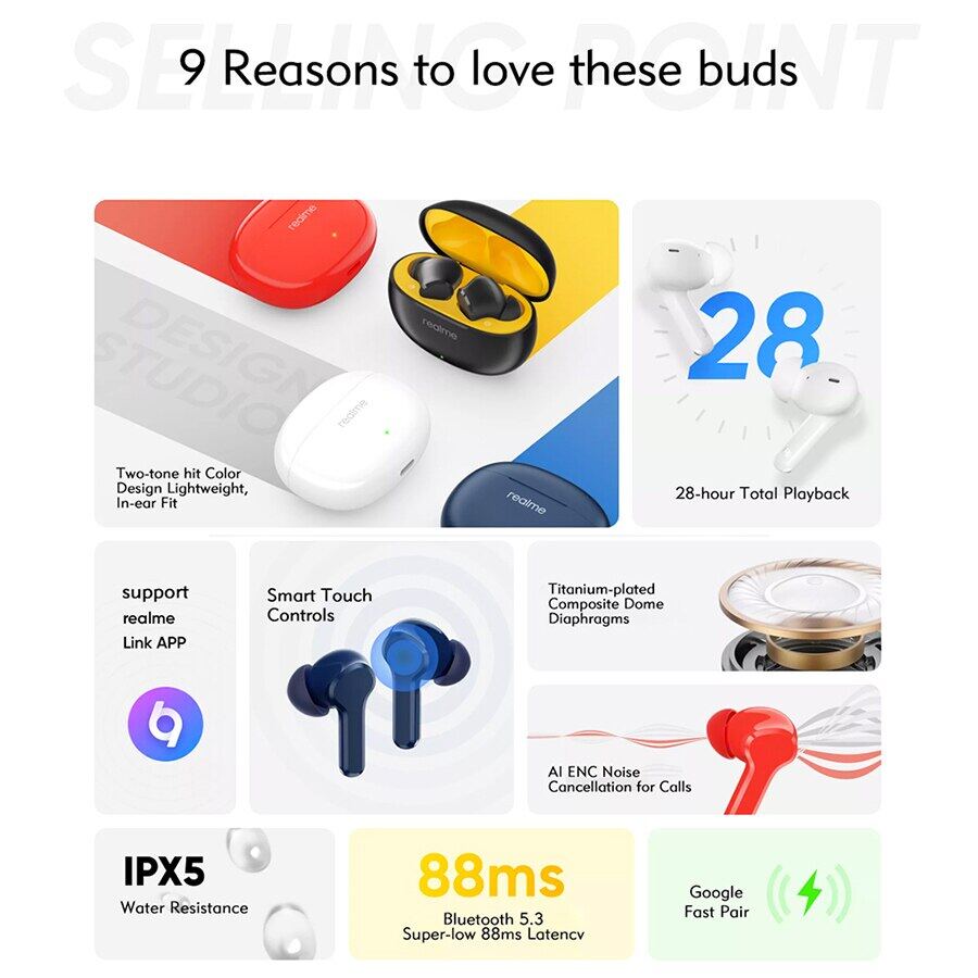 Original realme buds T100 Earphones Bluetooth 5.3 AI ENC Ture Wireless Headphones Long Battery Life TWS IPX5 Waterproof Sport Headset