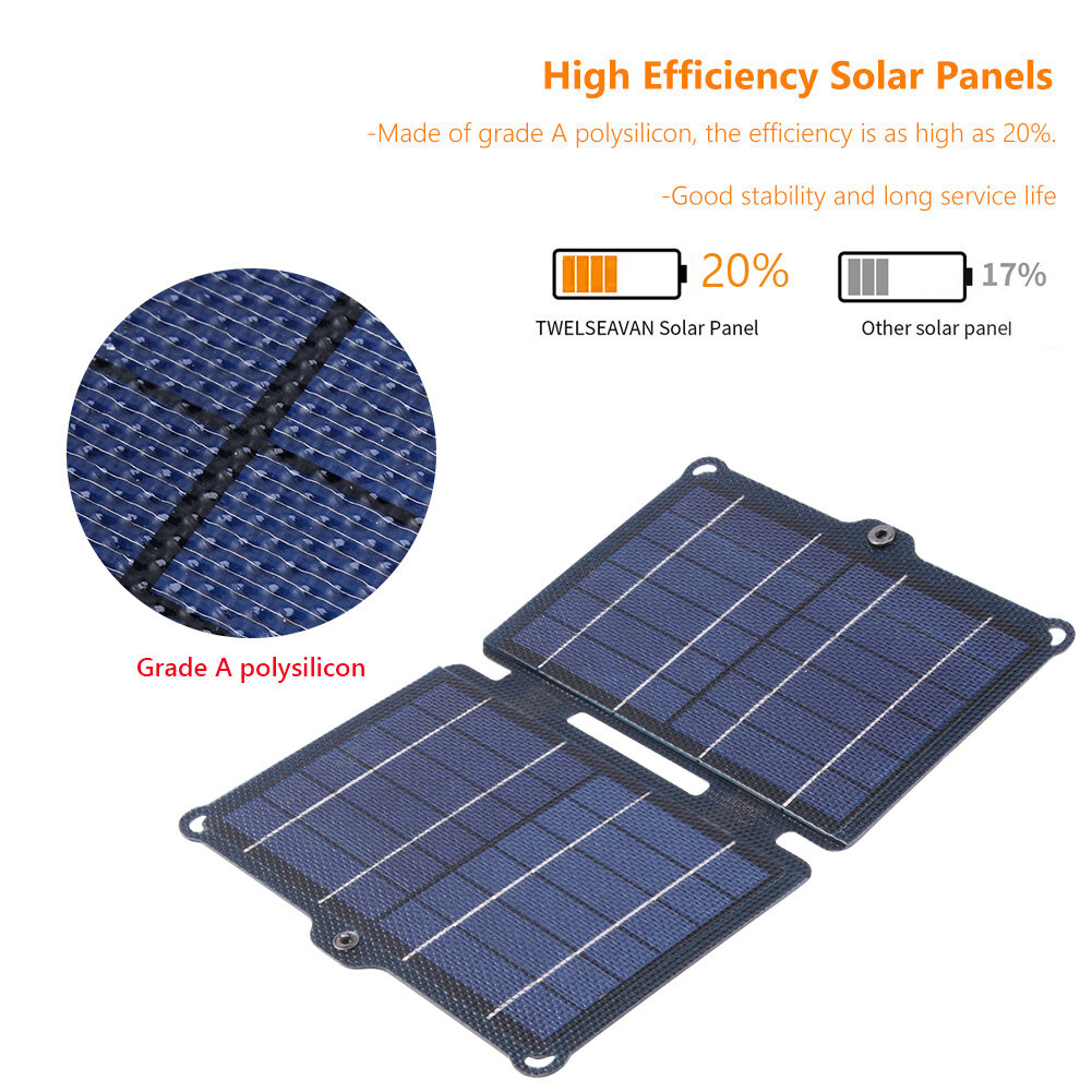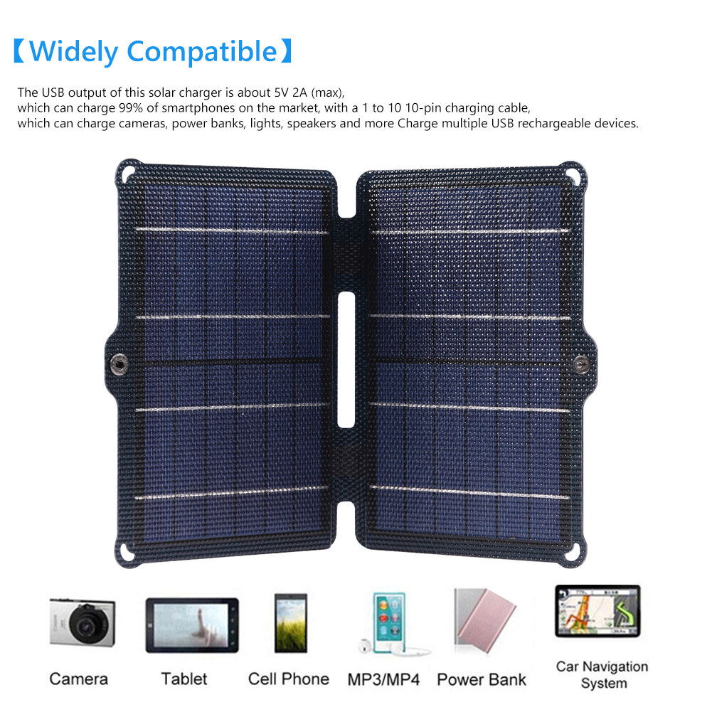 1. High Efficiency Solar Panel: This 10W solar charger is made of A-grade polycrystalline silicon solar panel with up to 20% efficiency. This means you'll get more power and faster charging in the same sunlight conditions.