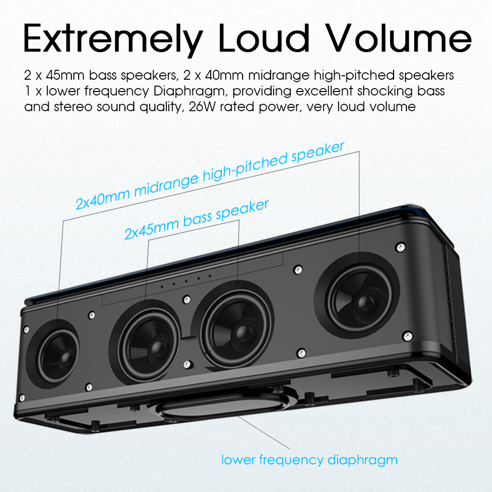 1). the speaker equiped with 2 x 45mm Bass Speakers, 2 x 40mm midrange high-pitched speakers, 1 x Bass Diaphragm, 26W Rated Power ( 2x8W, 2x5W ), extremely loud volume.