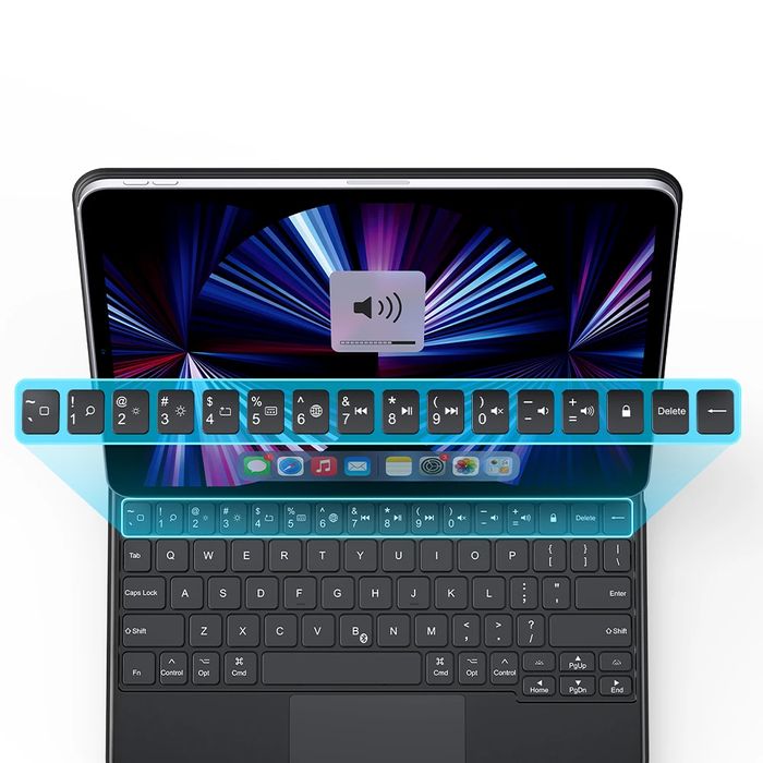 The full row of iPadOS shortcut keys let you switch tasks, adjust your screen, or change your music without leaving the keyboard.