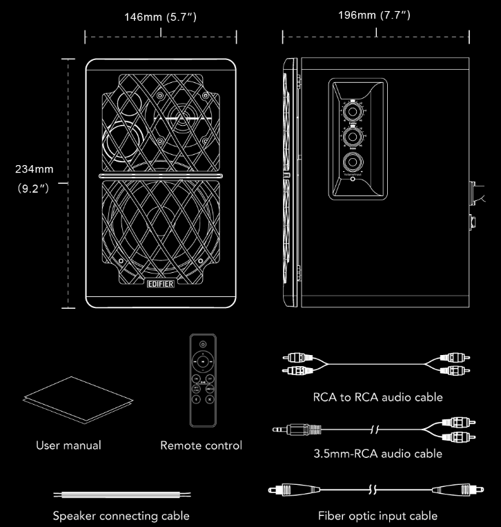 These impressive speakers are made from MDF wood, designed to effectively prevent resonance. You will love how perfect it fits into your living room, study room, or bedroom. Experience true freedom from wired connections with this Bluetooth speaker and enjoy the best audio. You can connect it to devices wirelessly using Bluetooth 5.0, suitable for iOS, Android, Mac, or Windows devices.Soundfield Spatializer simulates a larger soundstage with the touch of a button. This unique feature creates wide-filed sound by optimizing each channel, sending out opposite signals to eliminate mutual interference and improve separation.Protects your speaker drivers, easy to remove for cleaning. When connected the sub-out automatically detects the subwoofer and activates the digital crossover. Optical and coaxial inputs make sure you will always enjoy music with lossless sound quality. Dual RCA inputs allow you to connect to two devices at the same time. Connect to your devices such as phone, PC, laptop, tablet or gaming console with included Fiber Optical input cable, RCA to RCA audio cable, and 3.5 mm-RCA audio cable, eliminates the need to switch cables.Convenient dials on the side panel of the speaker allow you to adjust the bass, treble, and volume to fit individual preferences, press the volume dial to toggle between inputs.Adjust volume, mute/unmute, switch inputs, Bluetooth, select sound field extension, and line-in mode with the wireless remote, no need to leave the couch.