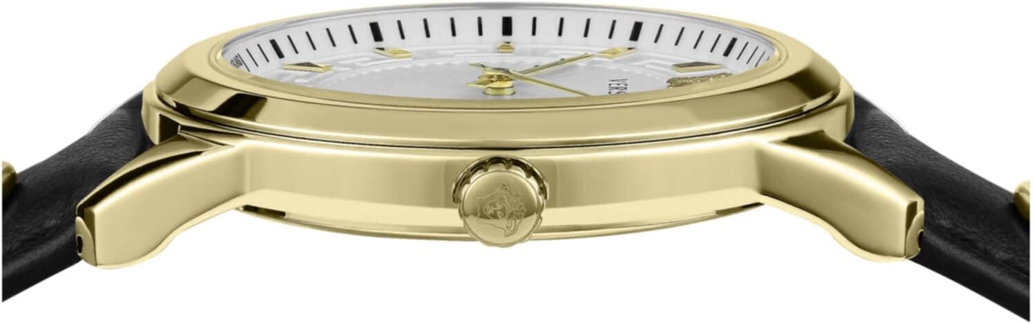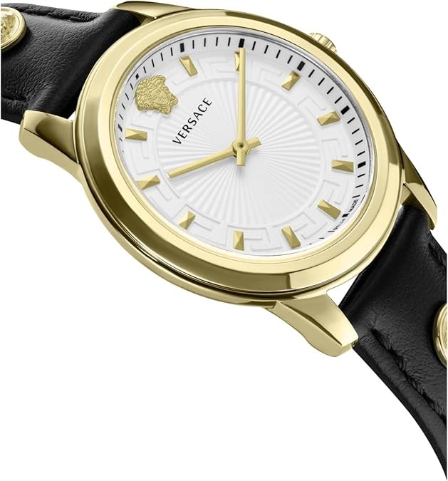 Versace Greca Collection Luxury Womens Watch Timepiece with a Black Strap Featuring a Gold Case and White Dial
